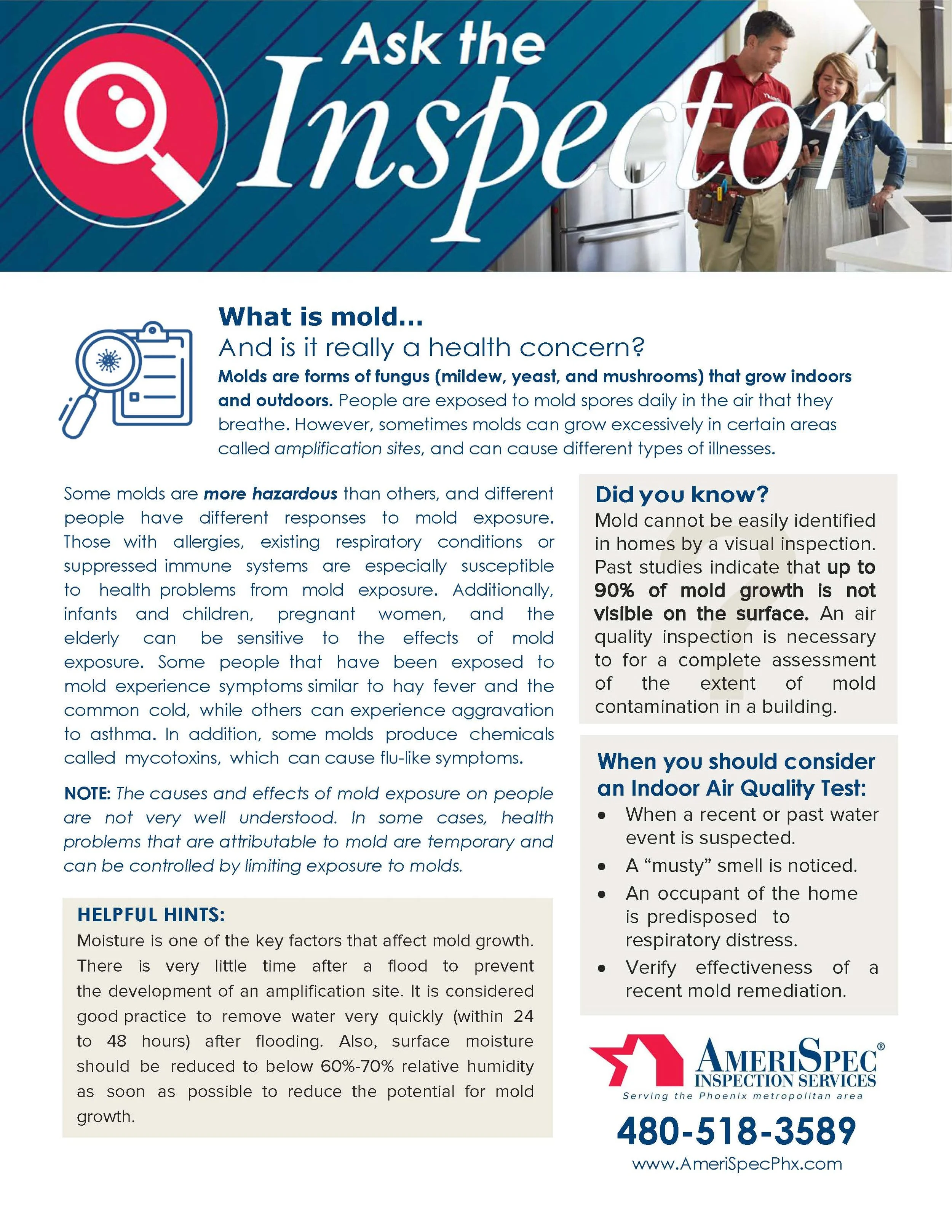 In an effort to inform our clients, we have designed an Ask the Inspector series. Throughout this series we will cover home inspection topics important to homeowners and housing industry professionals. Feel free to browse through our current and past issues. These issues can be downloaded or printed for future reference.